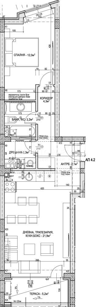 We present to you a two-room apartment in a new residential building, located in a prestigious location in the Ovcha Kupel district, just a two-minute walk from the "Ovcha Kupel 2" metro station, commercial sites, schools, and public transport stops. The apartment is located on the 4th of 9 floors and has the following functional layout: entrance hall, southeast living room with kitchenette and access to a panoramic terrace, separate bedroom, bathroom with toilet, closet/laundry room. The building is constructed with high-quality materials - high-class Shuco joinery, heat pump system, installed underfloor heating in each apartment, luxurious common areas, controlled access, and video surveillance. Completion date - mid-2026.