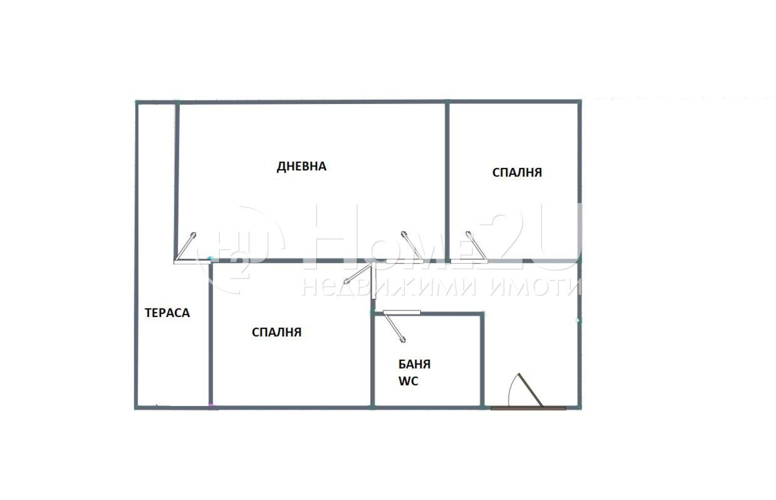 Разпределението е както следва:Коридор, дневна с излаз на тераса, спалня с излаз на същата тераса, втора спалня и баня с тоалетна.