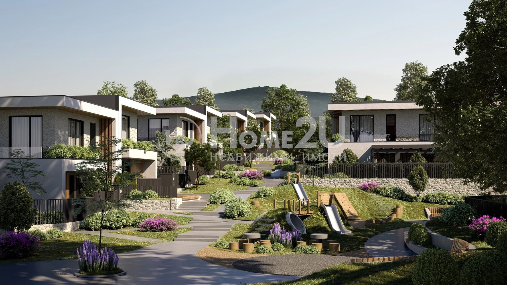 Затворен жилищен комплекс включващ 4 типа къщи и 6 самостоятелни сгради с апартаменти. Комплекса ще има всичко необходимо вътре за живот без излизане от него. Пешеходната зона е отделена от пътната, за гарантирано спокойствие и по-добра среда на живот. Всяка къща разполага със собствен двор около 1000 кв.м.