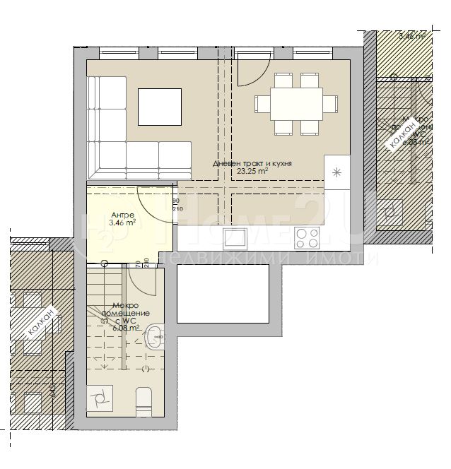 Ет. 1 – дневен тракт с кухненска част и излаз на веранда, баня и тоалетна, сервизно помещение