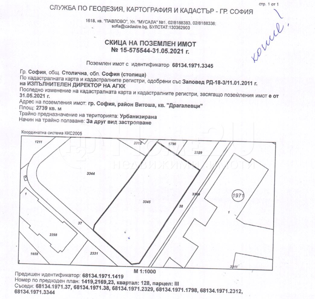 В съседство с новоизграденото частно училище BRITANICA Park School в кв. Драгалевци- УПИ с площ 2739 кв. м. Районът е с новопостроени и новостроящи се сгради . Парцелът е с правилна правоъгълна форма.