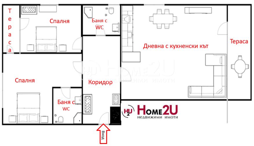 Две НЕпреходни спални с обща тераса, една от които е със собствена баня, коридор и втора баня с тоалетна.