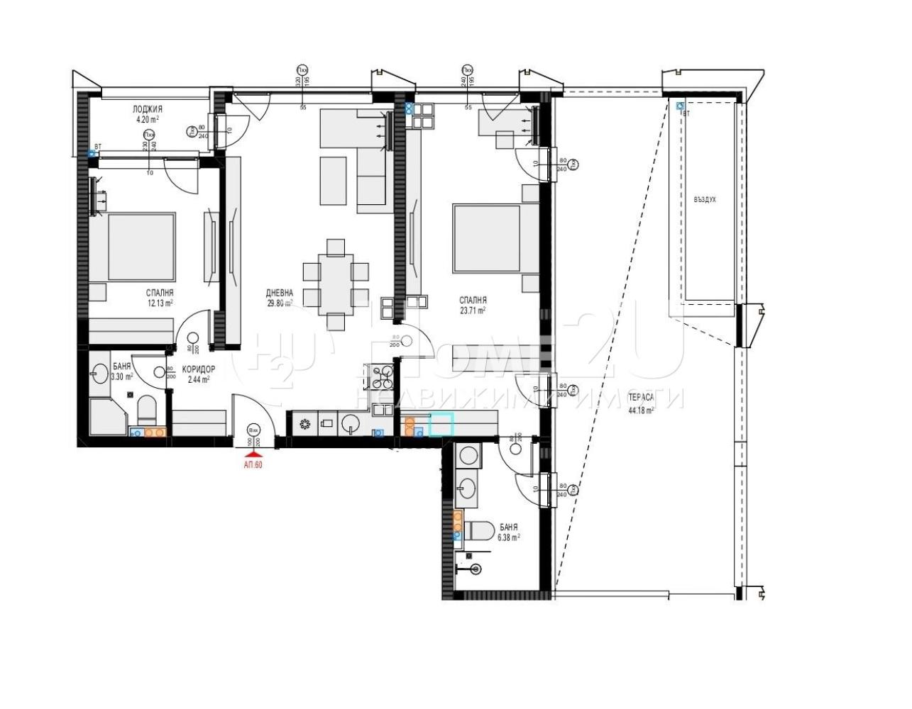 Имотът се състои от входно антре, 30,00 кв.м.просторна дневна, френски прозорци , спалня с баня и лоджия към нея и още една спалня от 24 кв.м. с баня 6 кв.м. и открита тераса.