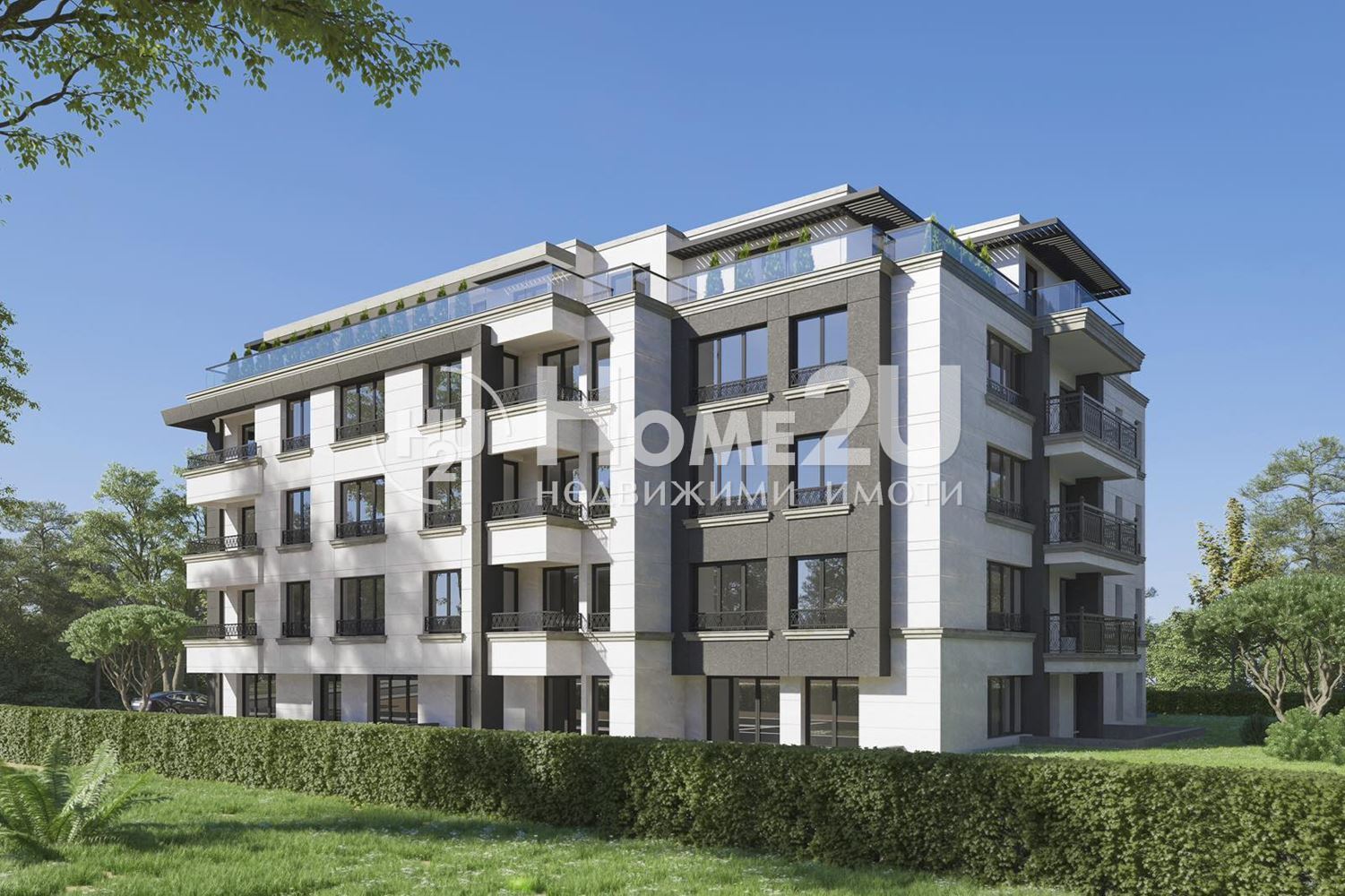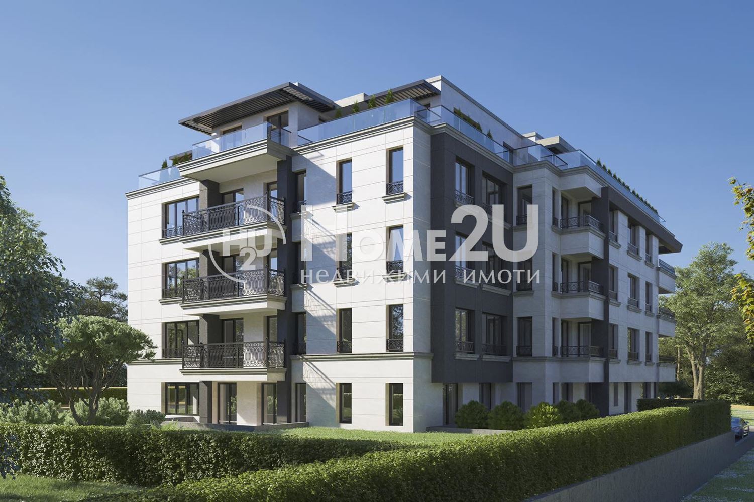 Входни врати: висококачествени блиндирани врати. Общи части на сградата Коридори и стълбища покрити с естествен камък в комбинация със стилен парапет.