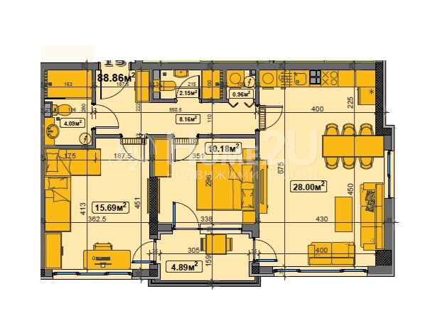 Всички жилища са много светли и слънчеви, а от по-високите етажи на южната страна се разкрива панорамна гледка към Витоша. Жилищната сграда е на 6 етажа. Броят на обектите е 42 - от тях 2 ателиета – едностайно и двустайно и 40 апартамента – двустайни, тристайни и един четиристаен. Тристайният апартамент в настоящата обява се намира на трети /среден етаж/ и се състои от коридор, баня с тоалет, втори санитарен възел, килер, две спални, хол с кухненски бокс и общ балкон към трите стаи. Изложението на имота е източно. За допълнително улеснение прилагаме схема с разпределението на имота и визуализации на примерен проект за интериорен дизайн. За допълнително улеснение прилагаме схема на разпределението на имота. Обадете се сега и цитирайте този код: 126987!!!