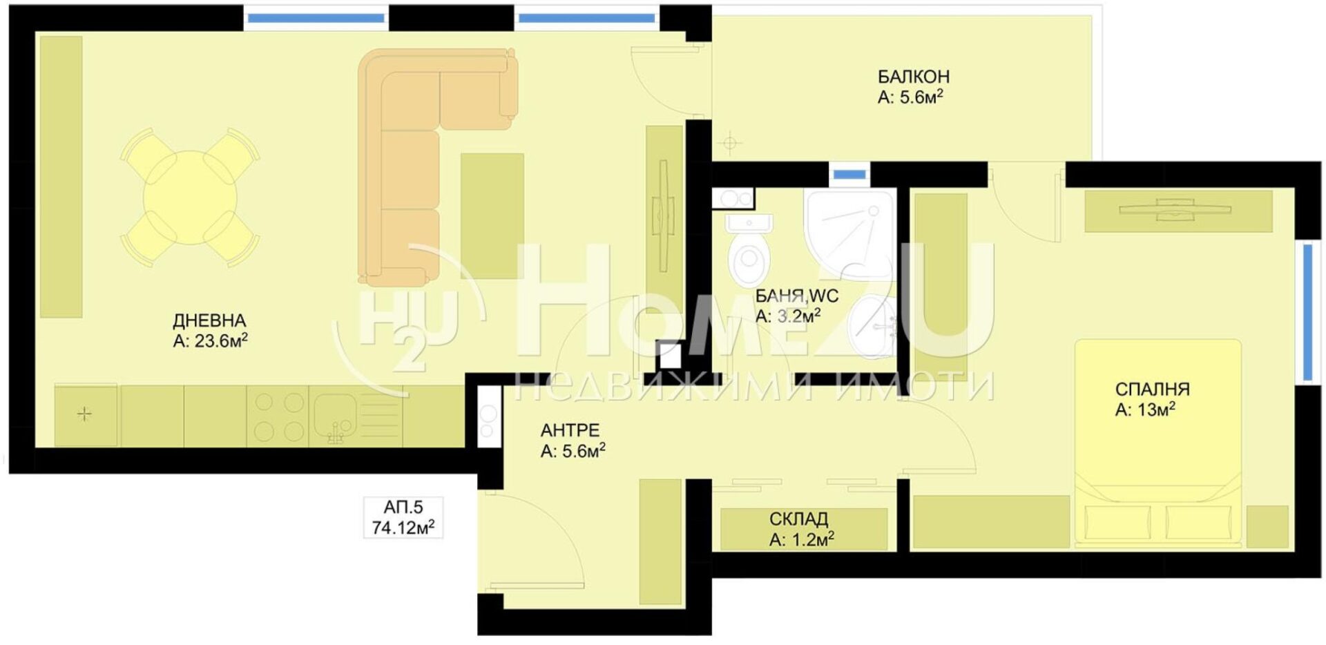 • Области: 74 m2