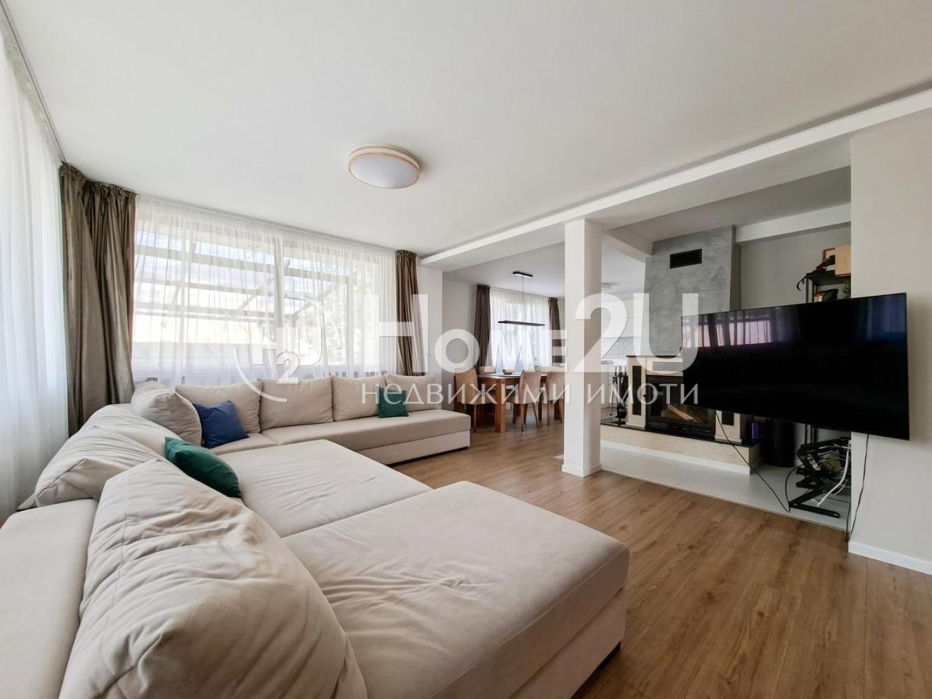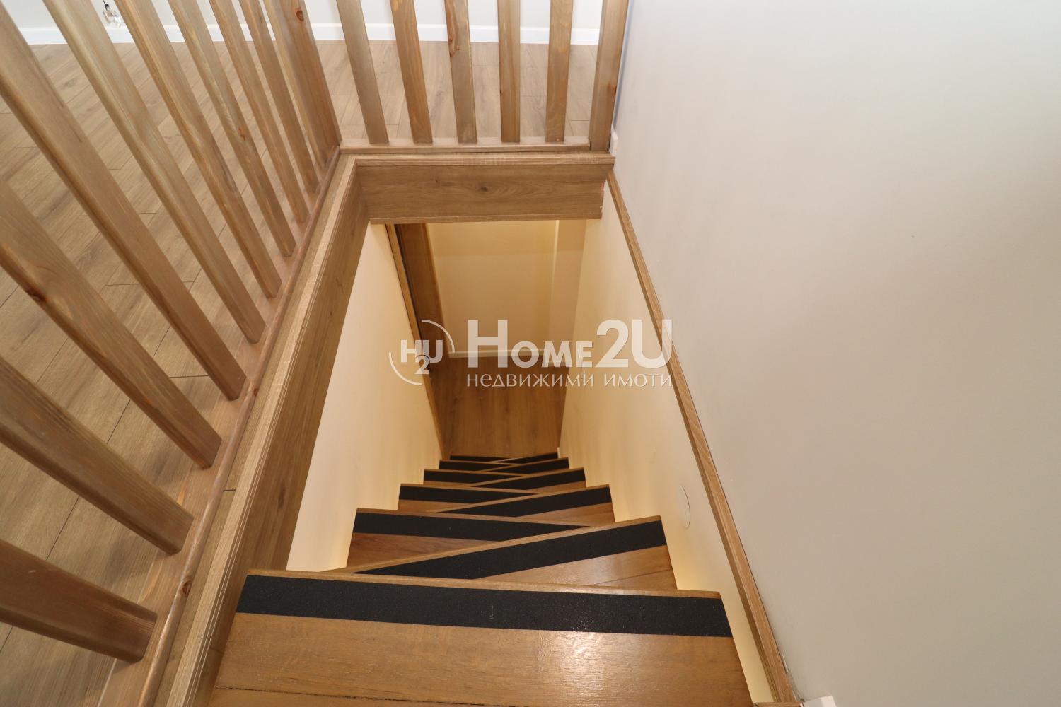 Етажът предлага функционално разпределение, светли и просторни помещения и усещане за уют и уединение. Разпределението е както следва: входно антре, просторна всекидневна с излаз на тераса, кухня, две спални, баня с тоалетна, баня с тоалетна, мокро помещение на етажа, заедно с две стаи на сутерен. Отоплението е решено по следния начин: парно с газов котел и камина в дневната с въздуховоди до спалните. Имотът е обзаведен с всичко необходимо за едно домакинство, уреди свързани с Wi-Fi и ‘умно’ управление през мобилно приложение или google home.