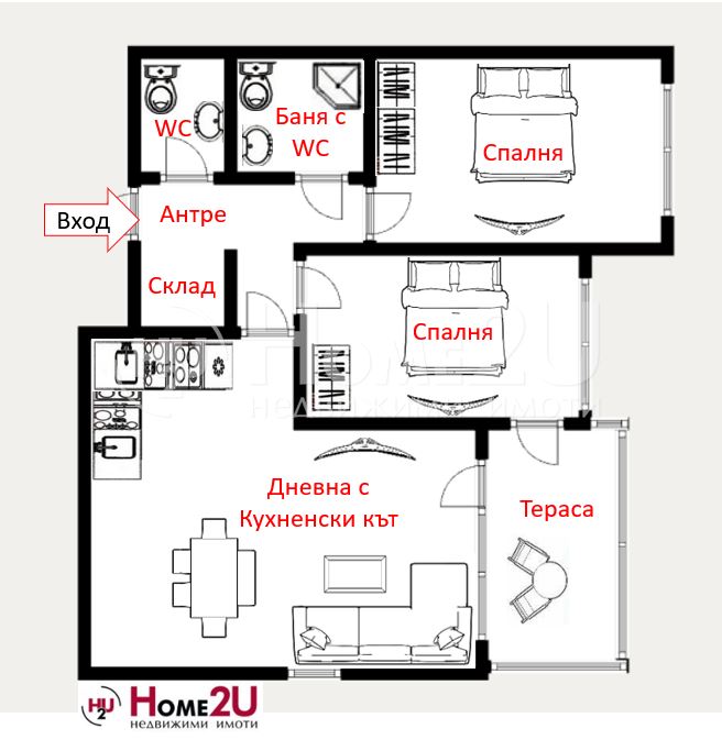 Квартира находится на среднем этаже, с юго-восточной ориентацией!Состоит из просторной гостиной с кухонным уголком, ДВУХ спален, ванной комнаты с туалетом, второго туалета, прачечной, террасы!
