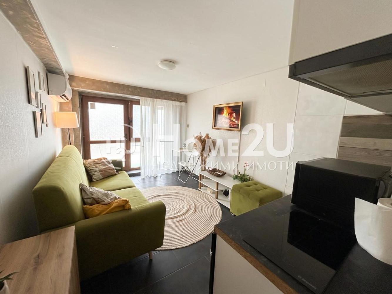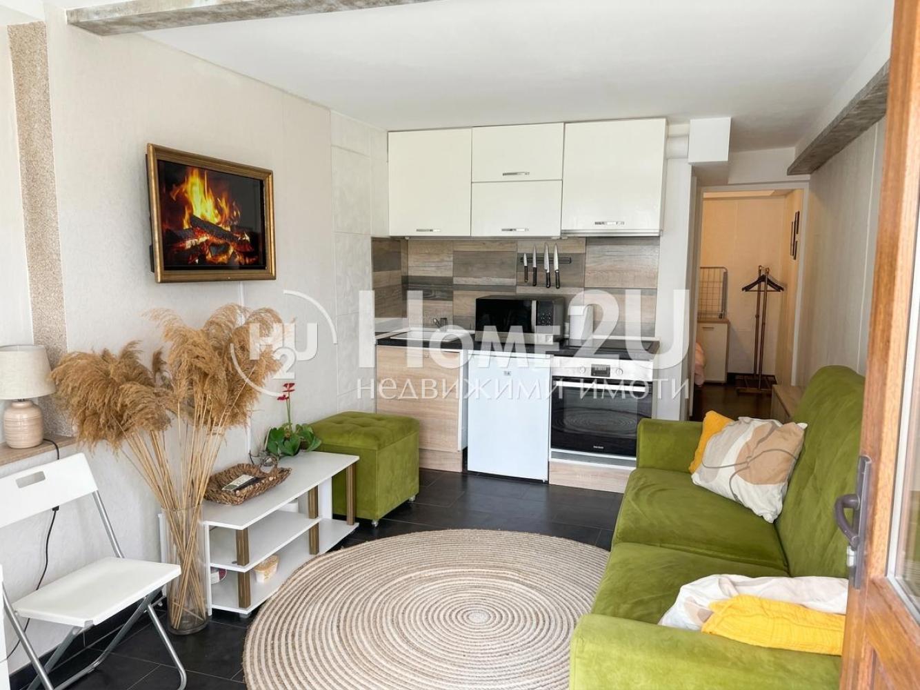 —Предлагаем в аренду двухкомнатную квартиру. Объект состоит из гостиной с кухонным уголком, спальни и санузла. Квартира полностью оборудована и меблирована, есть холодильник, плита, вытяжка, стиральная машина, сушильная машина; отопление — кондиционером.